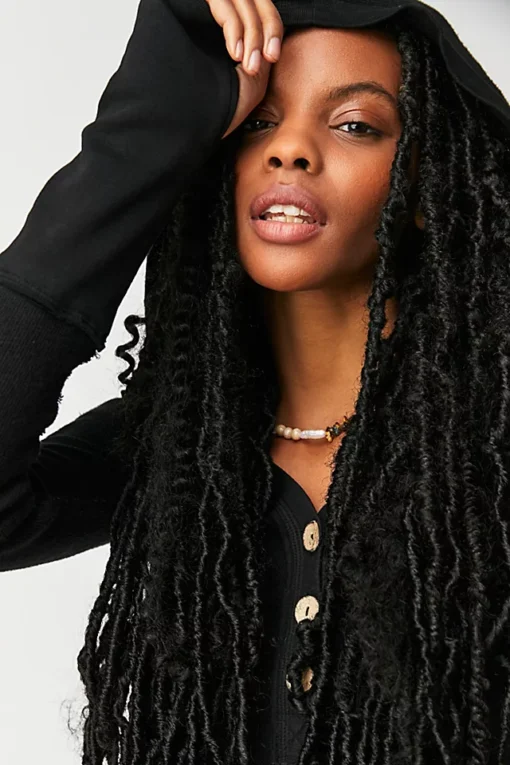 Features: Henley-style neckline. exposed seaming. hooded detail