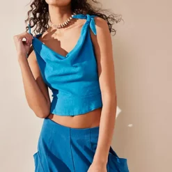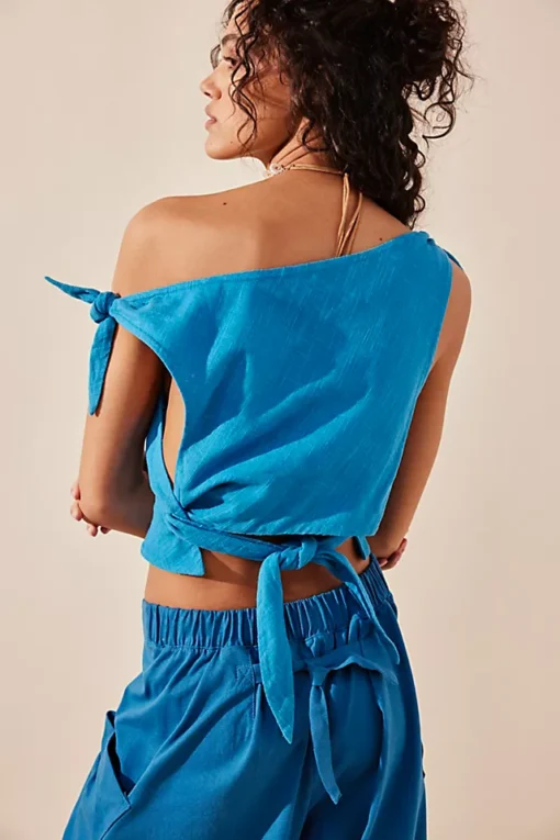 Features: Off-shoulder neckline. peplum-inspired hem. tie-back closure. wide boat neckline