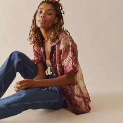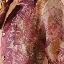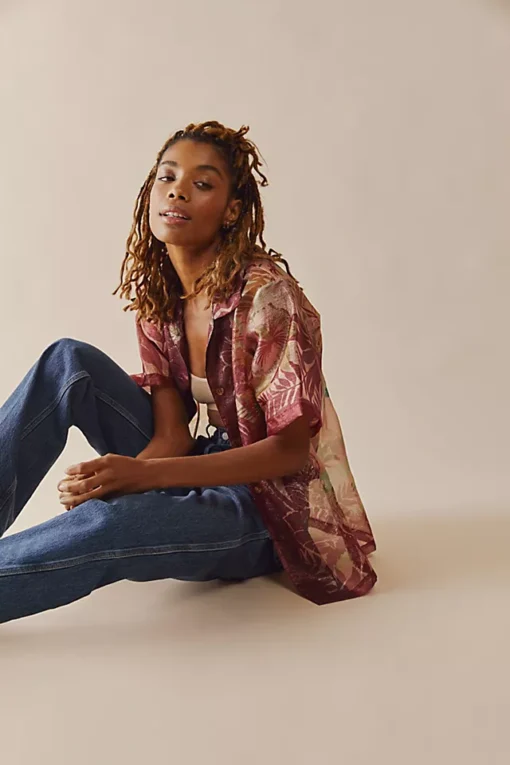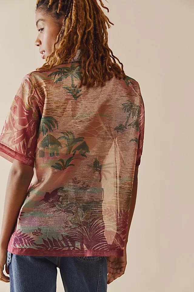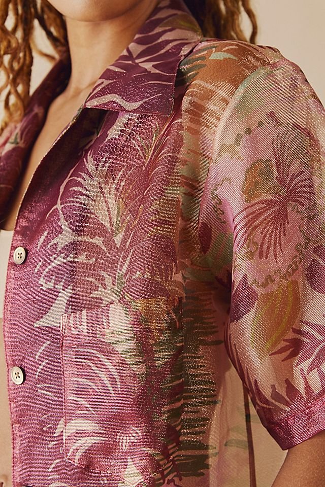 Totally timeless in a tropical print. this forever essential button-down top is featured in a staple short sleeve silhouette and semi-sheer. textured fabrication for added dimension.