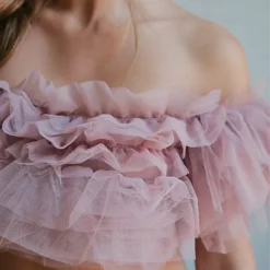Features: Ruffled fabrication. frilly short-sleeves. scoop neckline with a low scoop back