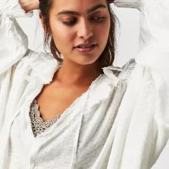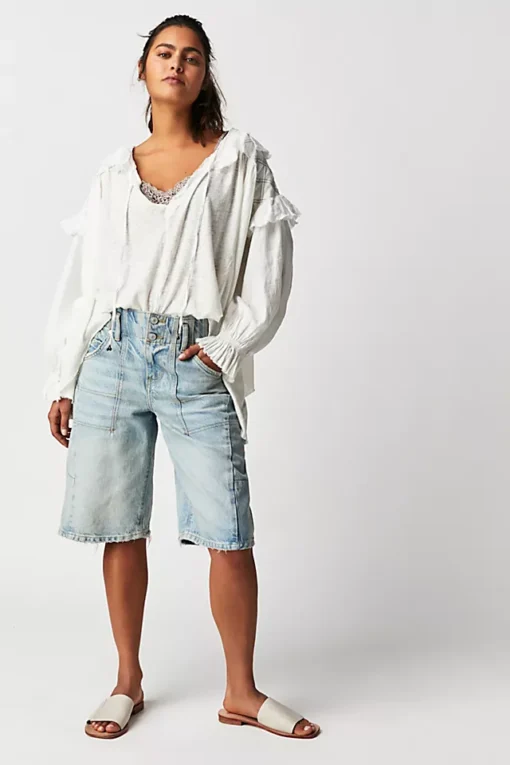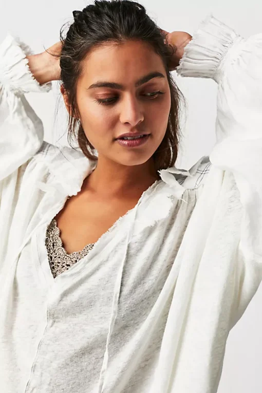 Totally timeless in a drapey. relaxed fit. this ruffle-adorned tunic top features plaid stitching at shoulders. exaggerated sleeves. and raw hems for a true lived-in look.
