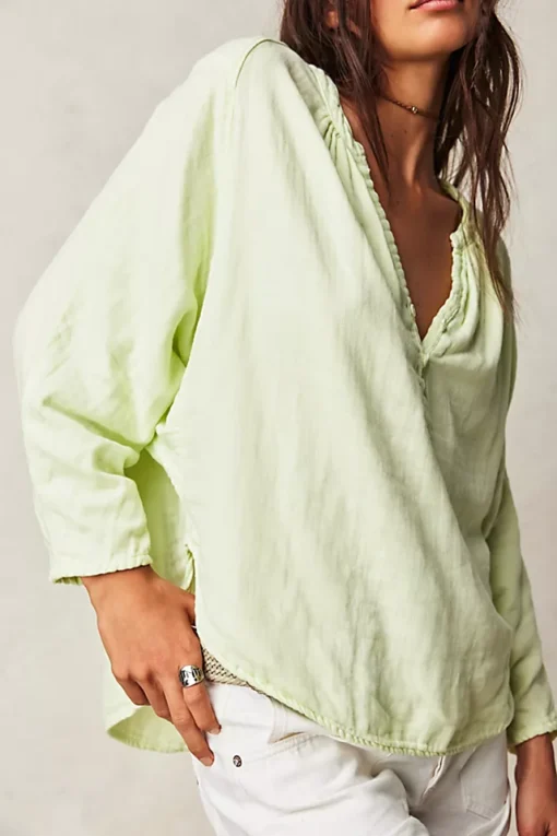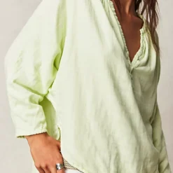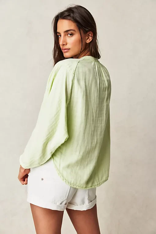 Features: Button-front neckline. rounded bottom hem. dropped shoulders
