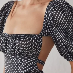 Features: Satiny fabrication. puffed sleeves. square neckline. ruched bust with bow-tie detailing. open back with strappy detailing and adjustable ties. flattering seaming throughout