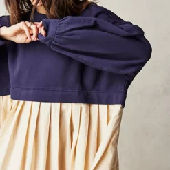 Stand out in this sweet and special sweatshirt featuring a slouchy. cropped top piecing and exaggerated pleating at bottom for added dimension.
