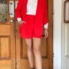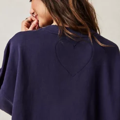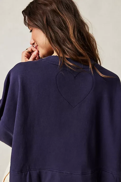 Features: Scoop neckline. dropped shoulders. pleating at bottom. heart stitching at back. slightly exaggerated sleeves