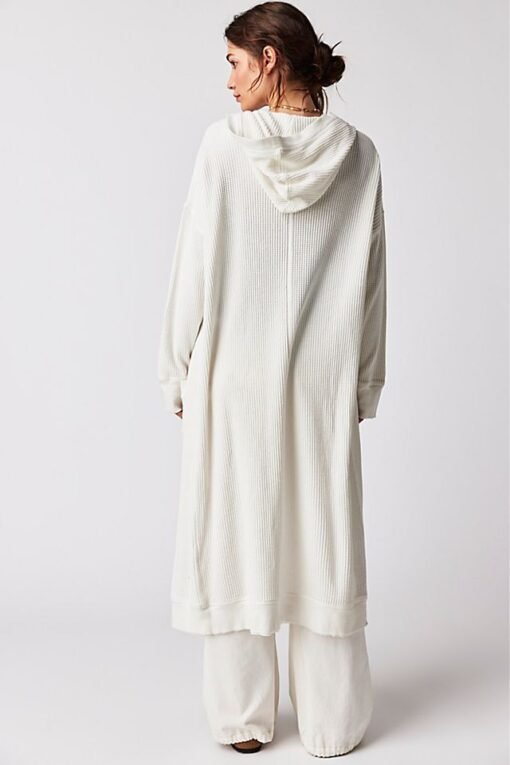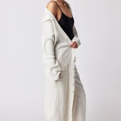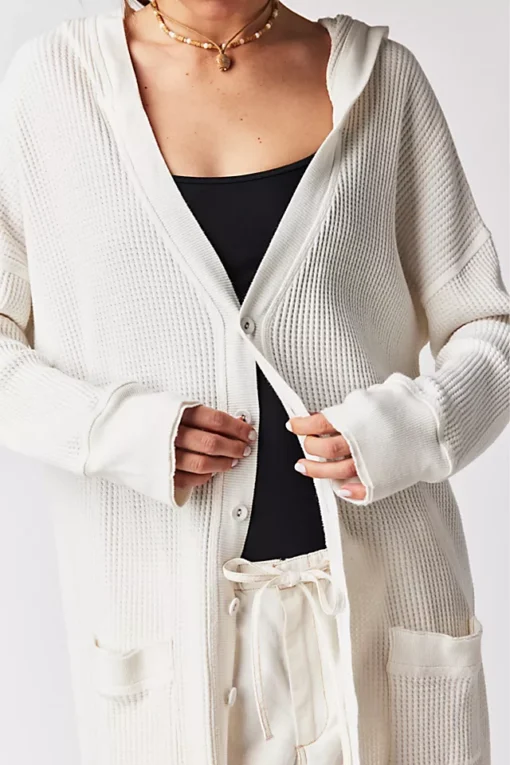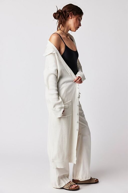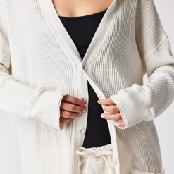 Add the loveliest layer to any look with this so cool cardigan featured in a light weight. longline silhouette and waffle knit fabrication with contrast stitching throughout for added dimension.