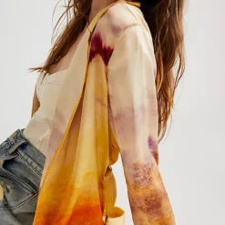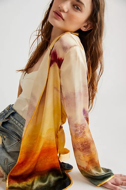 Inspired by the sunset. this stunning. blazer-inspired jacket is featured in a gorgeous. tie dyed silk fabrication with classic shawl collar and waist tie detail for added shape.
