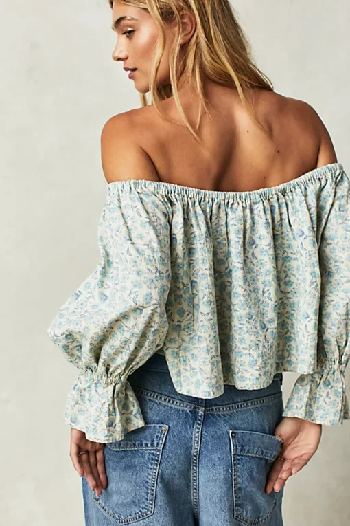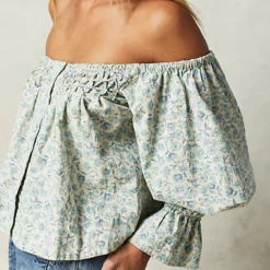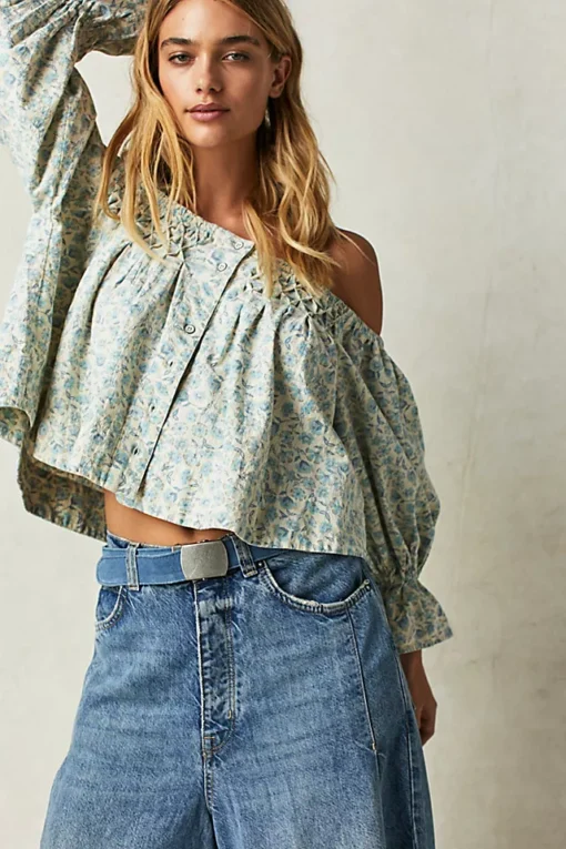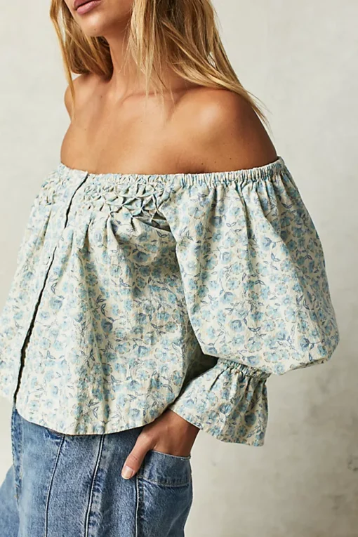 Just as effortless as it is ethereal. this smock style top is featured in a button-front silhouette with versatile off-the-shoulder neckline. forever femme floral print throughout. and exaggerated sleeves for added shape.