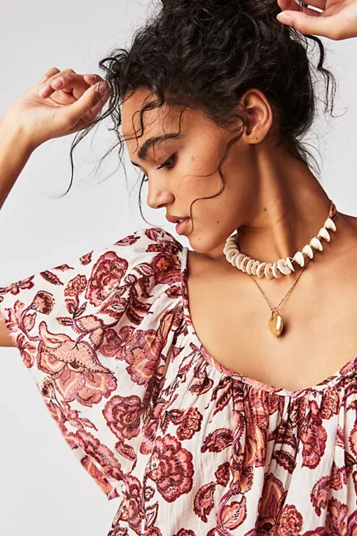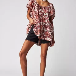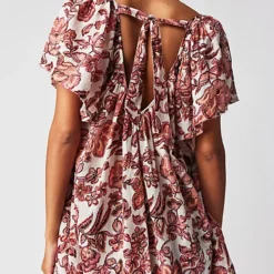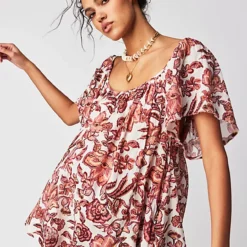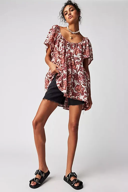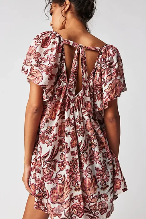 Printed to perfection in a free and flowy design. this timeless tunic is featured in a babydoll-inspired design with scoop neck. flutter sleeves. and tie detail at back for an added sweet touch.