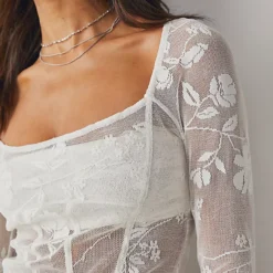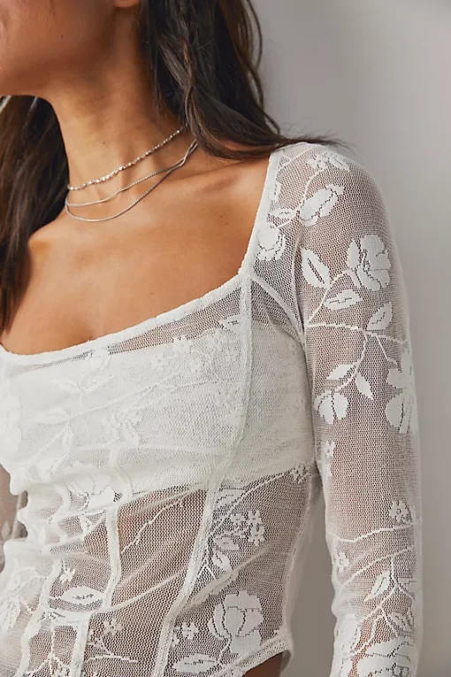 Features: Sheer lace fabrication. classic scoop neckline. floral detailing. seaming throughout