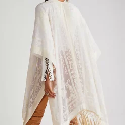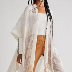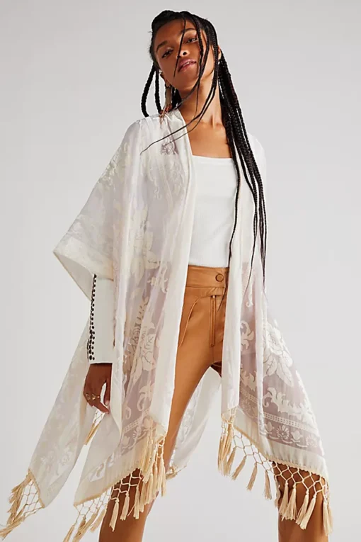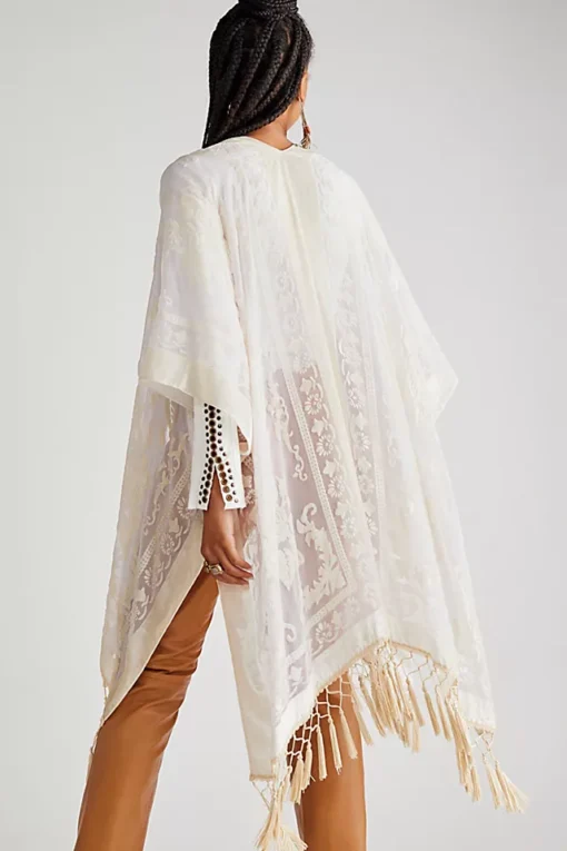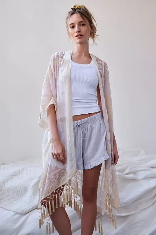 This luxe sheer kimono features a stunning velvet floral print design and fringe hem.