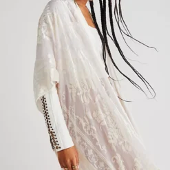 Features: Open-front design. armholes. side slits. sheer fabrication. velvet floral print. fringe hem