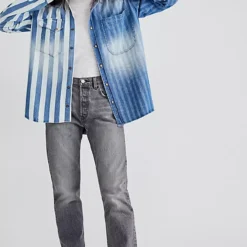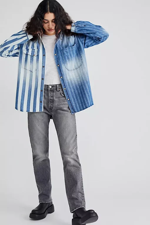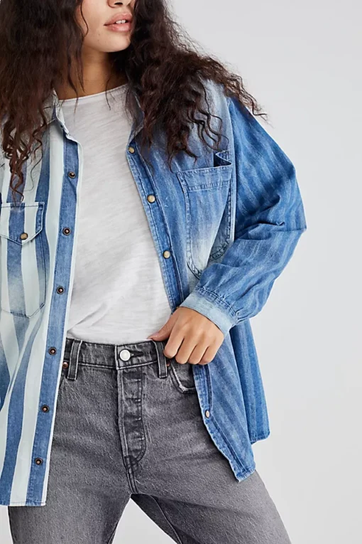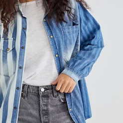 Forever cool and just as classic. this effortlessly essential top is featured in a staple. button-front silhouette and soft denim fabrication with contrasting stripe and super faded sides for added dimension.