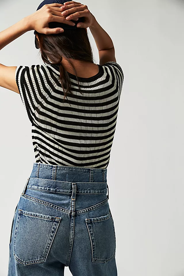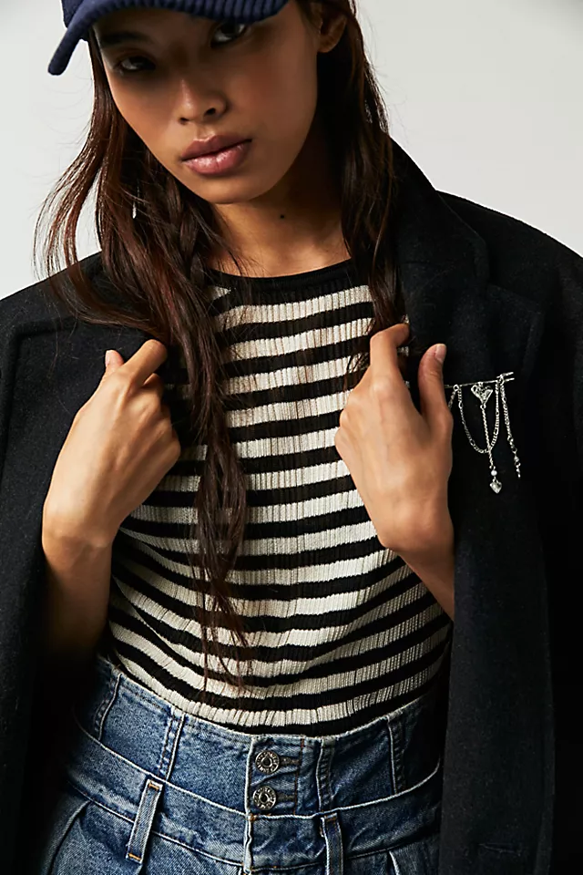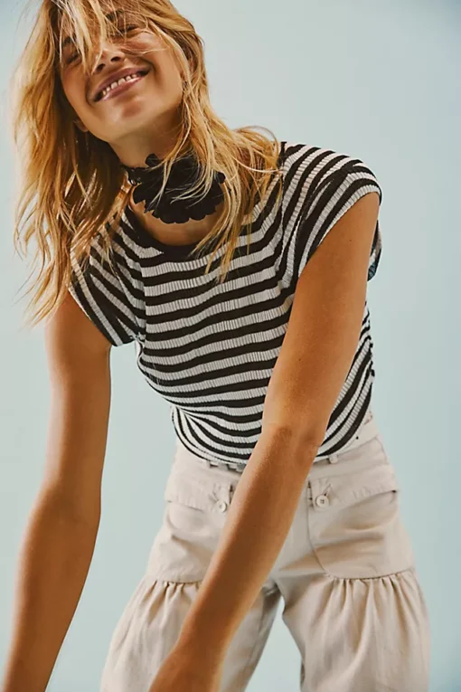 Totally timeless in a classic relaxed silhouette and knit fabrication. this effortlessly essential tee is striped to perfection with capped-style sleeves and ruching at sides for added shape.