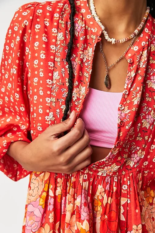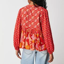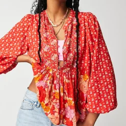Features: Button-front neckline. babydoll-inspired design. exaggerated sleeves. rounded bottom hem. elasticated sleeve cuffs