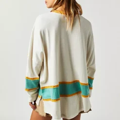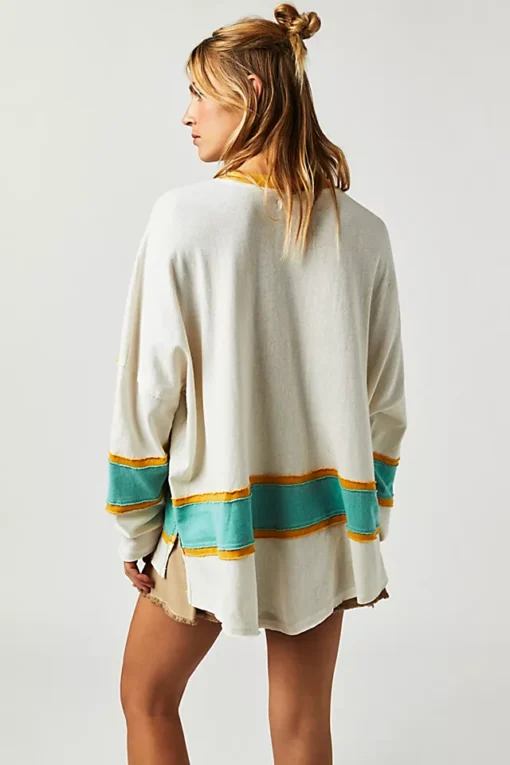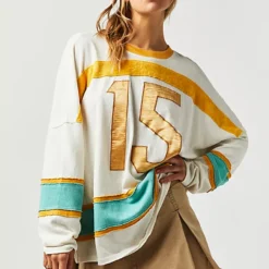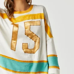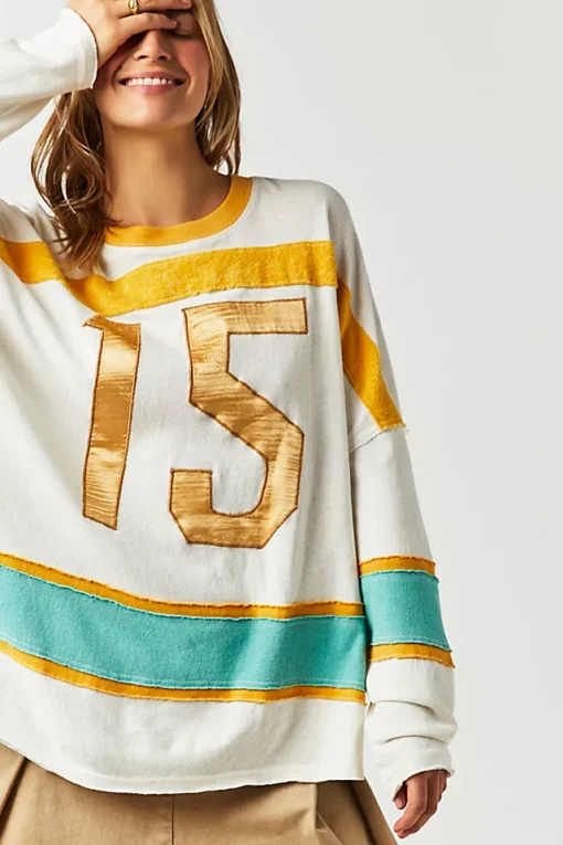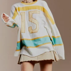 The perfect varsity-inspired pullover featured in an oversized. slouchy silhouette with colorful stripe and numbering detailing throughout and subtle distressing at seams for a true lived-in look.