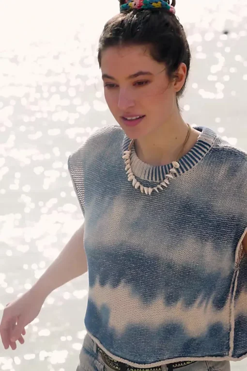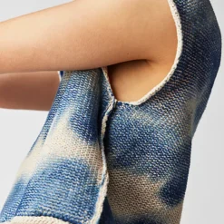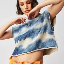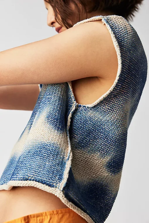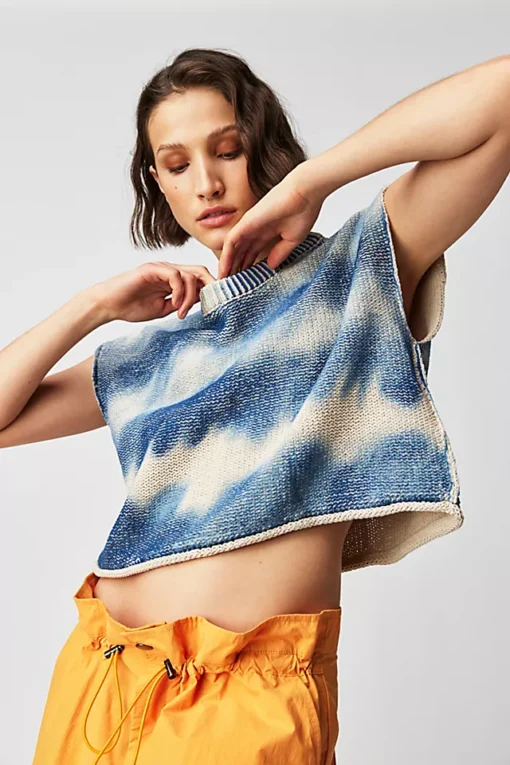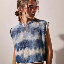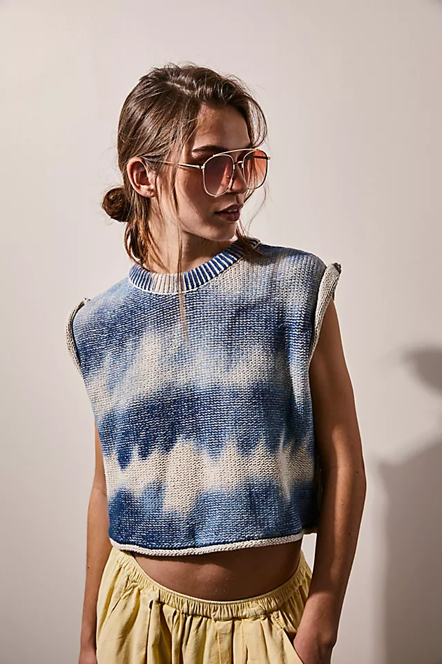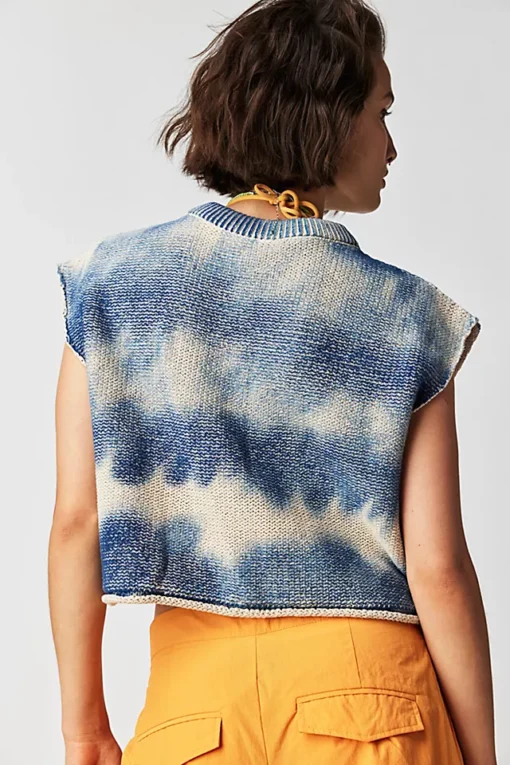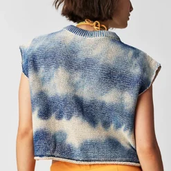 So cool and classic in a boxy. cropped fit. this stand-out sweater vest is featured in a tie dyed knit fabrication with defined shoulders and raw hems for a true lived-in look.