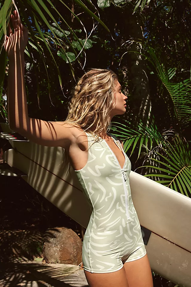 Perfect for pulling on before your next surf trip. this flattering one-piece is featured in a playful printed fabrication with a front-zip closure and boyshort-style legs.
