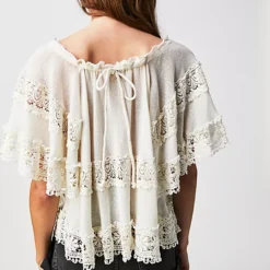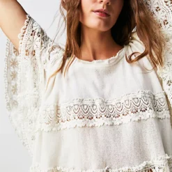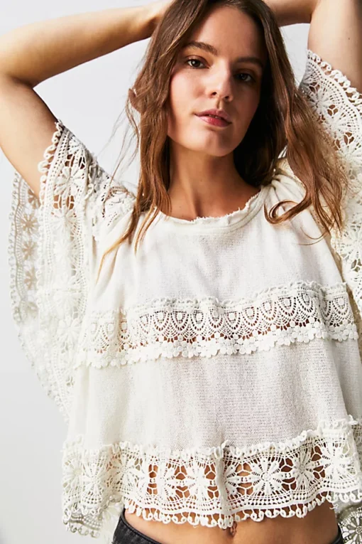 Stand out in this so sweet top featured in a drapey. relaxed fit with defined lace. flutter sleeves. and subtle distressing at hems for a true lived-in look.
