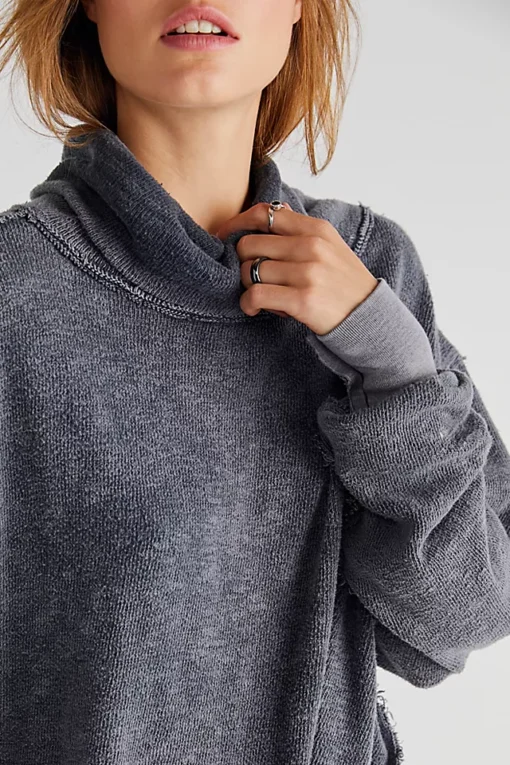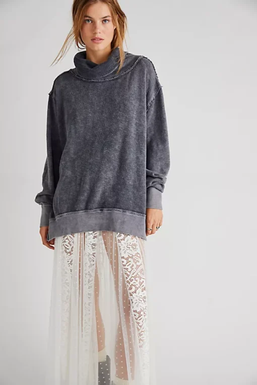 Forever effortless and just as essential. this timeless turtleneck pullover is featured in a slouchy. oversized fit with raw seaming throughout and side slits at bottom for added shape.