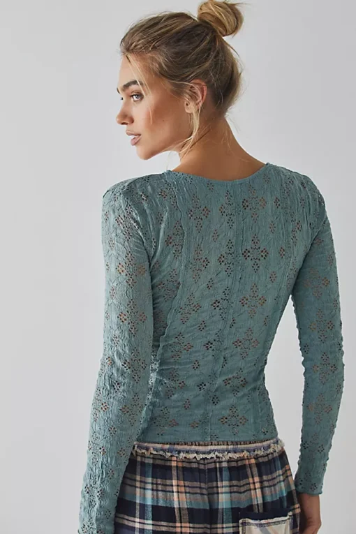 Perfect for layering up or down. this lacy long-sleeve features eyelet details and a square-neckline with fitted sleeves.