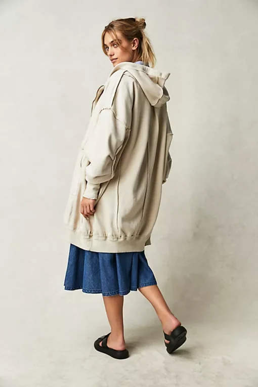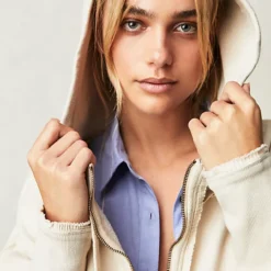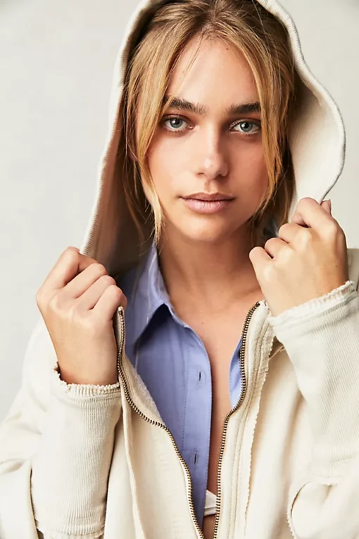 Features: Zip-front closure. hooded design. front pockets. exposed seaming