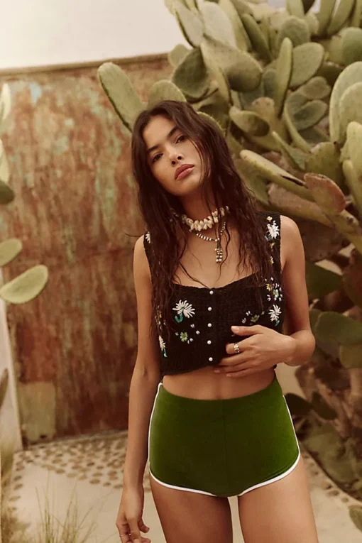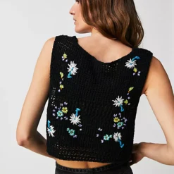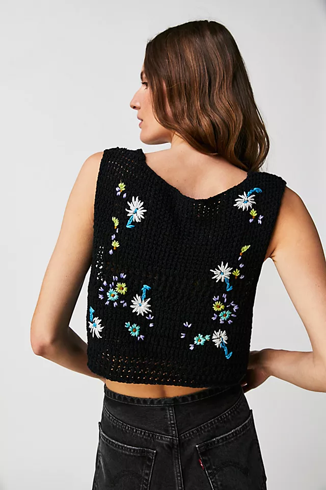 Cool and classic in crochet. this cropped tank features a pearl-style button-front closure and floral embroidery throughout for an added femme finish.